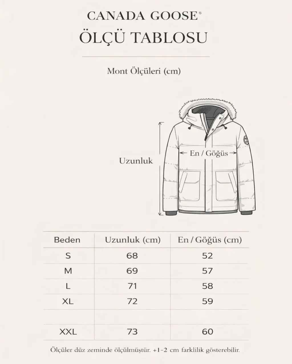 Canada Goose montlar genel olarak regular fit (normal dış giyim) kalıptır ve soğuk hava için tasarlandığından içine katman (hoodie/kazak) giyilebilecek şekilde planlanmıştır.